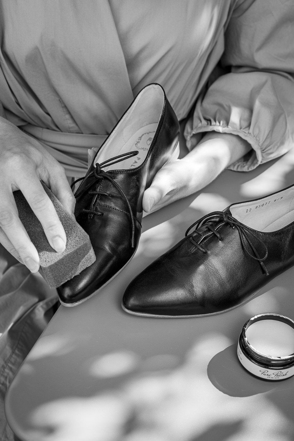Anna kenkävoiteen vaikuttaa muutama minuuttia ja harjaa kengät kiiltäväksi kenkäharjalla.