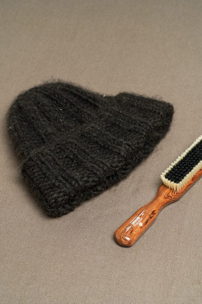 Levitä pipo napakalle tyynylle ja harjaa se sisältä ja ulkoa edestakaisin vedoin pehmeällä CP6-vaateharjalla. Tue pipoa harjatessa toisella kädellä ja harjaa neuloksen suuntaisesti.