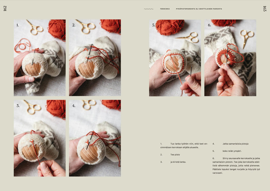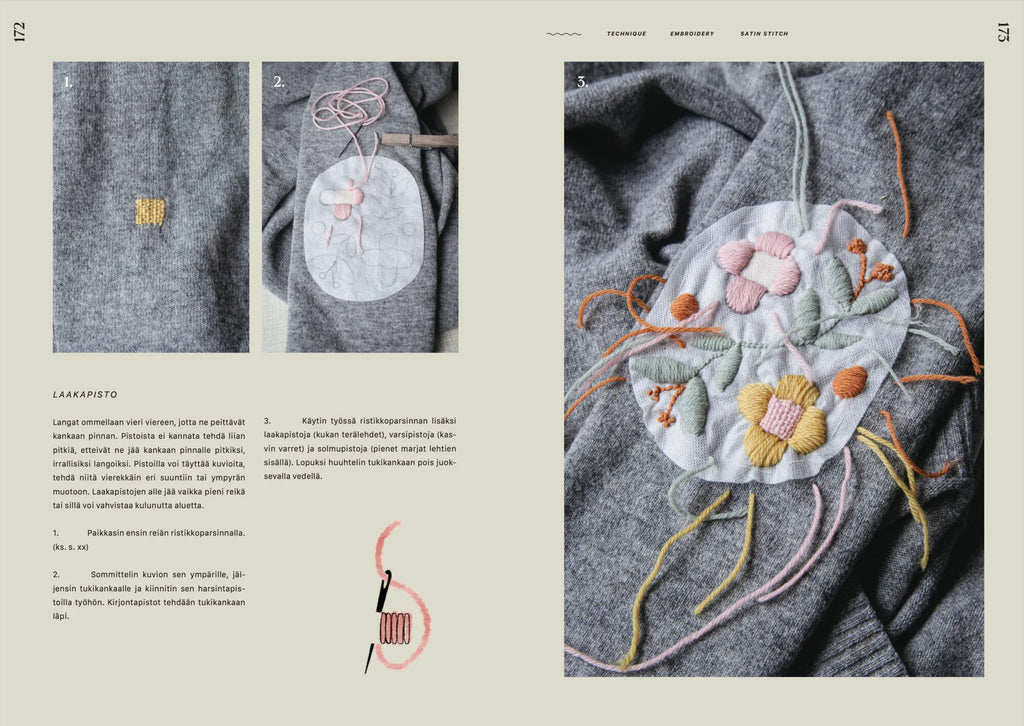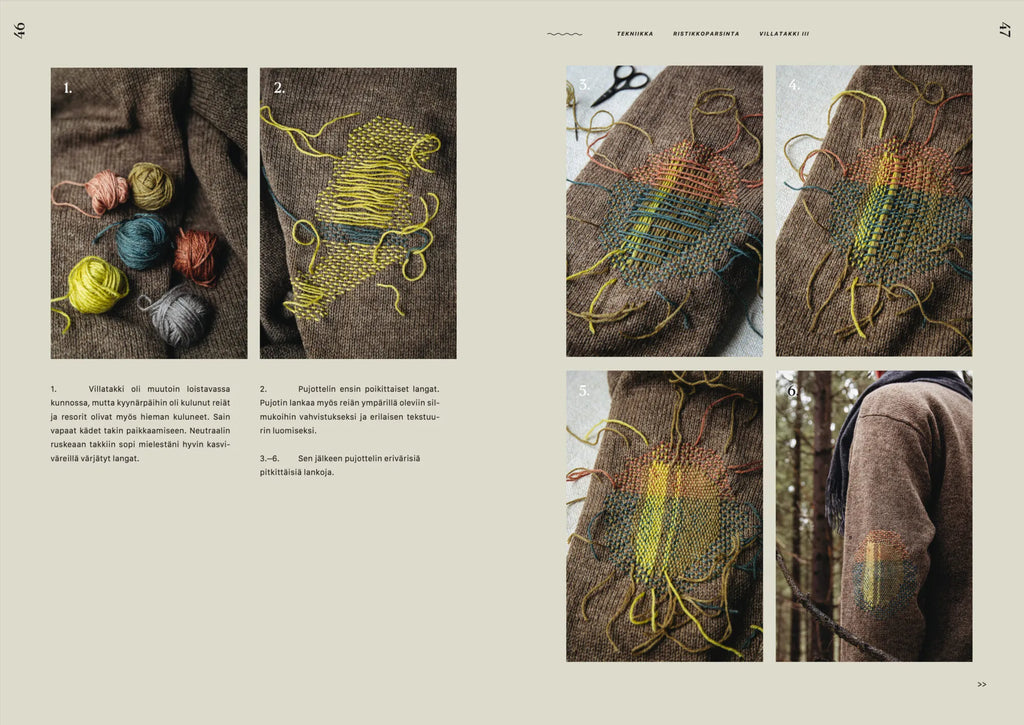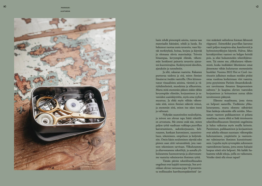 Paikkausajatuksia keskittyy paikkauksen taitoon, joka parhaimmillaan korjaa vaatteiden lisäksi meitä itseämme ja ympäröivää maailmaa. Kirja kannustaa välittämään vaatteista, olipa parsittavana sukka tai villapaita. Paikkaaminen ohjaa arvostamaan jo olemassa olevia materiaaleja.